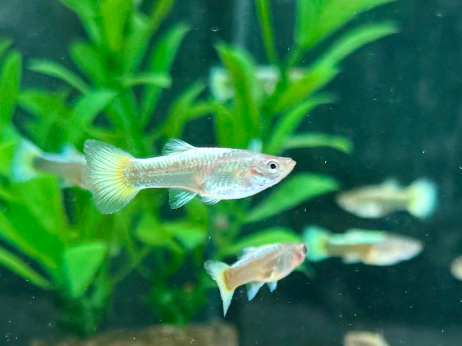 Der Full Golden Guppy erreicht eine Endgröße von etwa 3–4 cm. Männchen sind oft kleiner als die Weibchen und besitzen die auffällige goldene Schwanzflosse, die diese Zuchtform so einzigartig macht.